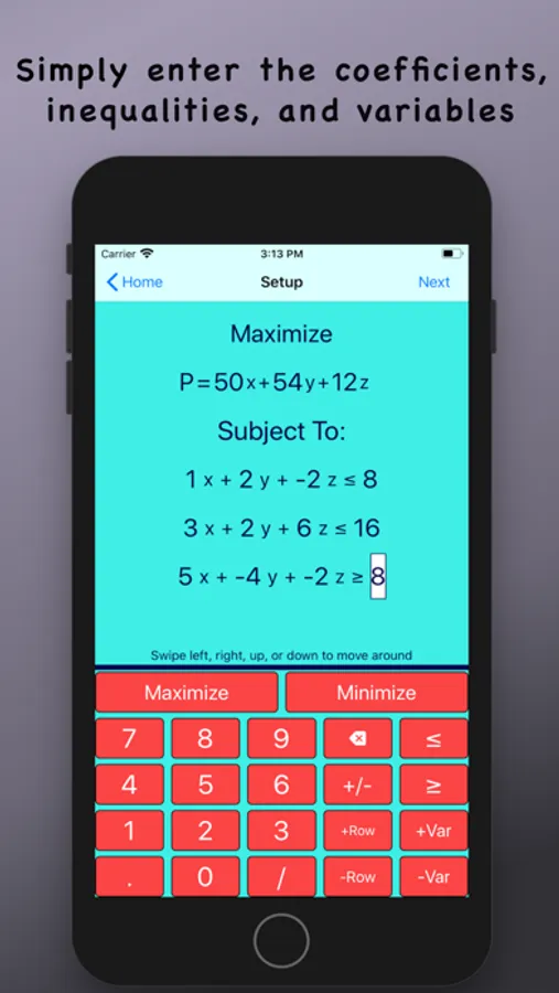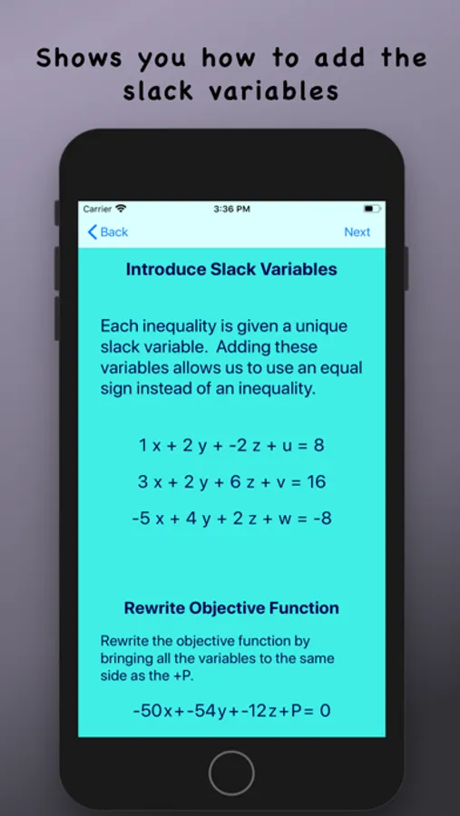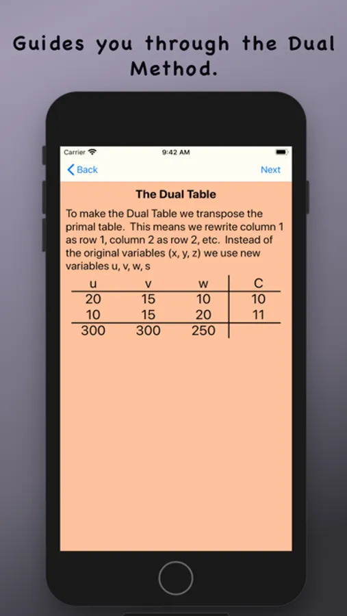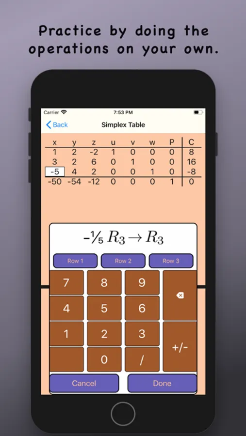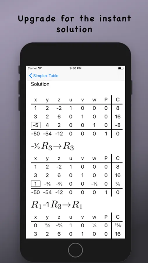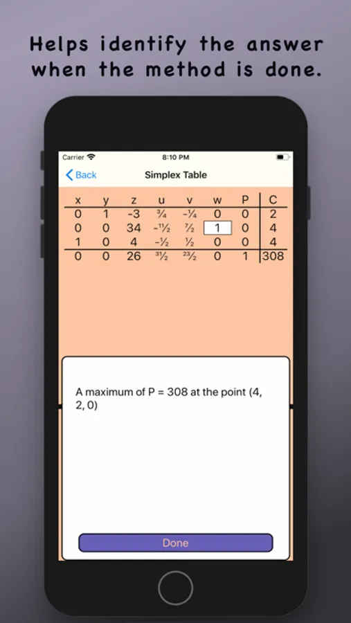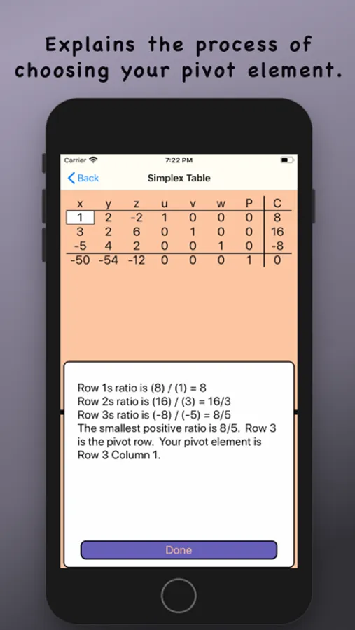 The Simplex Method involves using a sequence of "If/Thens" that lead you to the initial Simplex Table. This app walks you through the set up and creates the initial table. From there you can either use the method on your own or have it help you through Hints. Choose the operation and the app will generate the new table for you. You get to focus solely on practicing and experimenting.