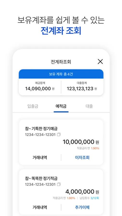- 전계좌조회, 거래내역조회, 이체, 계좌비밀번호변경 및 오류 해제