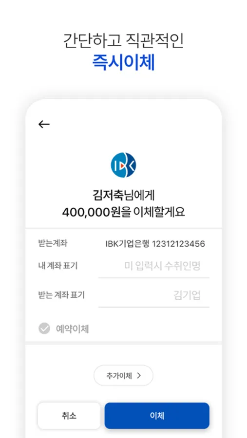 - 1일 300만원 한도 내에서 한번에 간편하게 이체(송금)할 수 있는 서비스