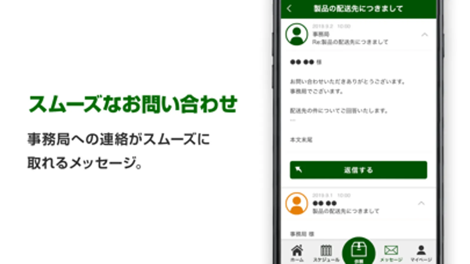 ・事務局と直接メッセージでやりとりすることができます。発注に関して不明点やトラブルなどがあった場合も、アプリからすぐに問い合わせることができます。