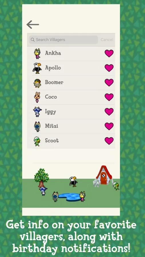 - Get detailed information on any villager that currently exists and favorite them to keep track of which ones live in your village so you can easily check their birthday or their favorite coffee