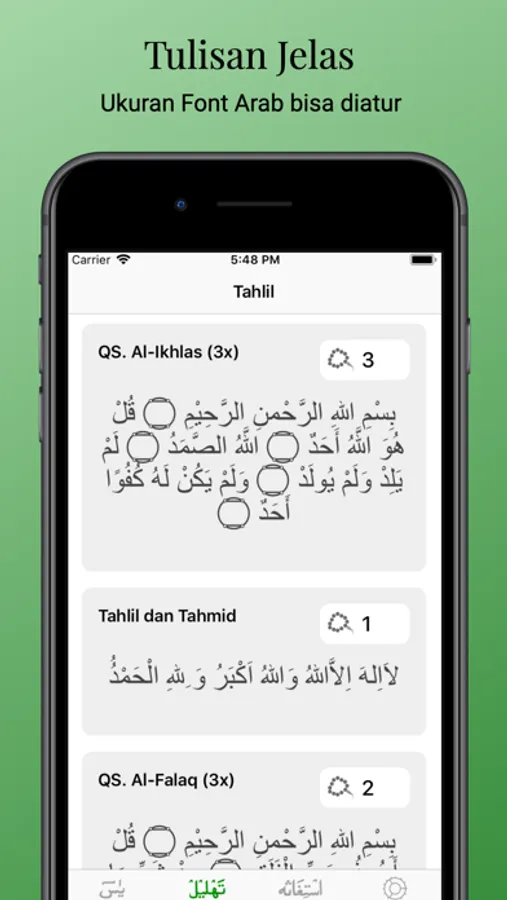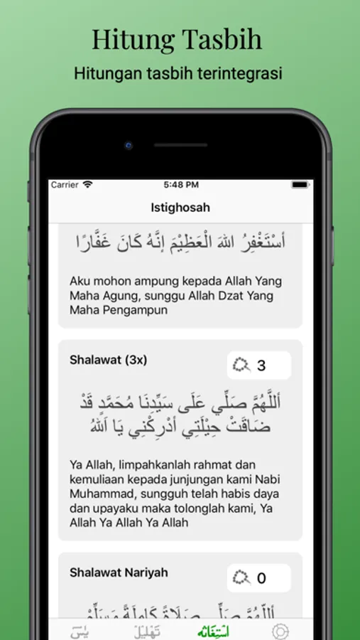 Terdapat fitur hitungan tasbih yang terintegrasi dengan posisi masing-masing bacaan/doa sehingga memudahkan untuk menghitung sambil meneruskan bacaan.