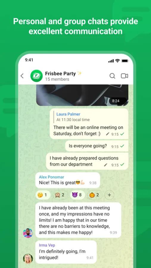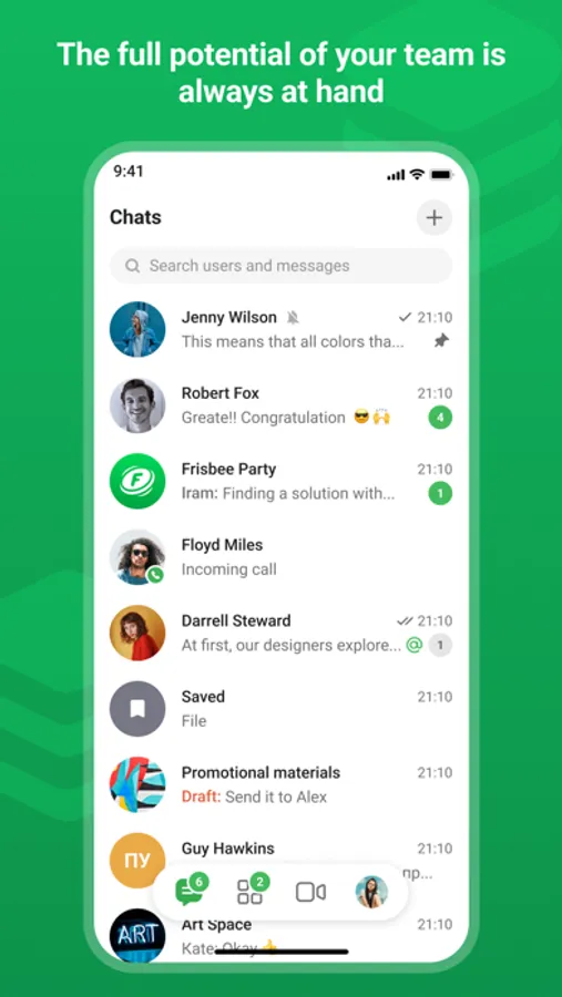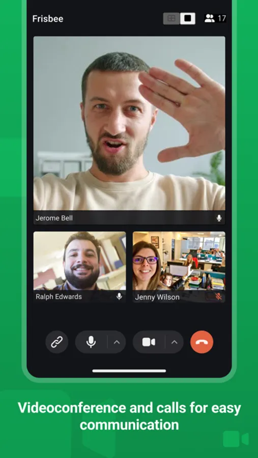 You can create social spaces in Frisbee and organize colleagues into groups based on tasks and interests. There you can exchange messages, calls, media files and links, as well as documents of any format.