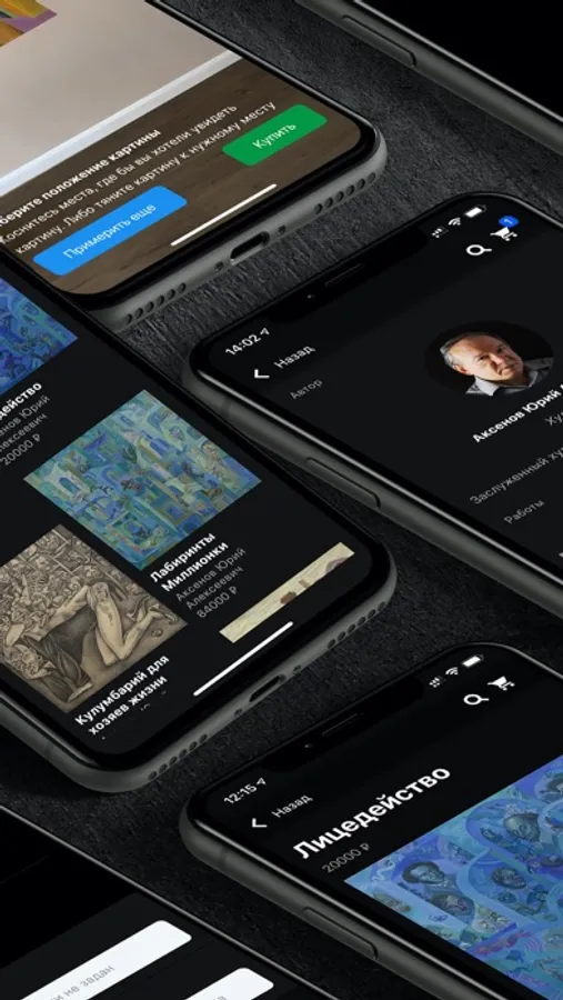 Приложение работает максимально интуитивно: простая лента картин не даст вам заскучать. Откройте любую картину тапом по ней. Исследуйте все работы интересующего вас автора. Нажмите на кнопку примерки на стену через AR. Добавьте в корзину понравившуюся картину и приобретите ее в один клик с бесплатной доставкой по всей стране.
