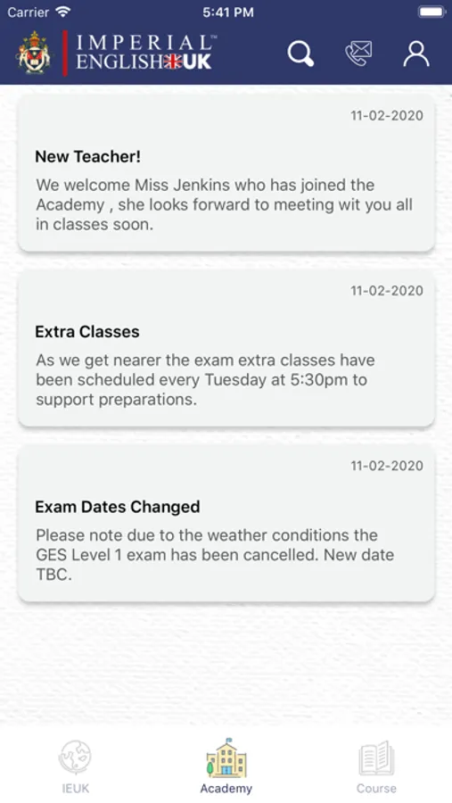 - IEUK Academy where students study regarding day to day changes at the centre such as school closures, timetables, room changes, new teachers, homework, etc.