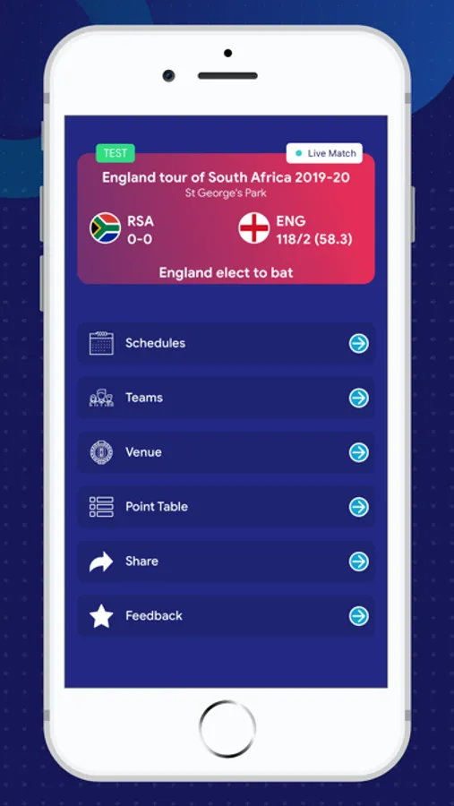 Now all matches schedule, live score, past matches, upcoming matches, player detail, team detail, venue detail,statistics will be on your hands.