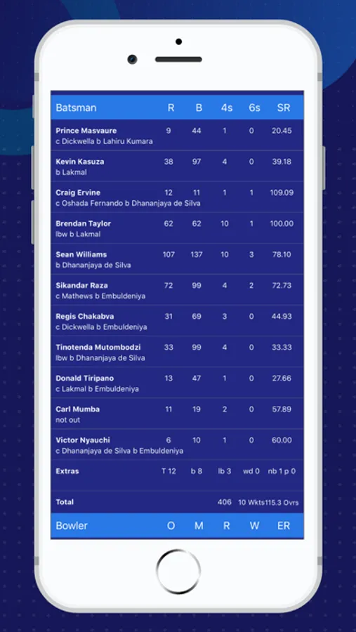 • View live scores and results in detail, with full innings scorecards including batting, bowling, fielding and fall of wicket information.