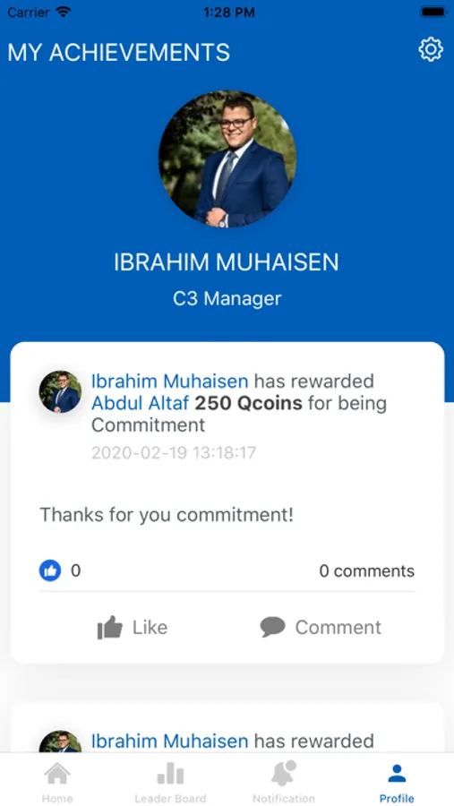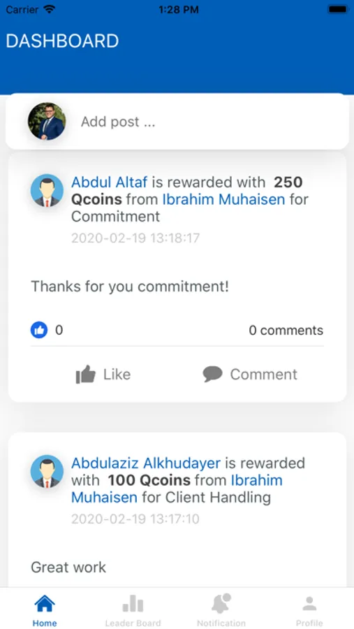 ● Home page where users can view latest updates in relation to who earned points and he can encourage colleagues by adding comments.