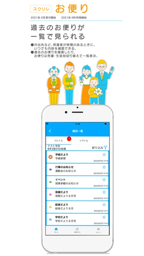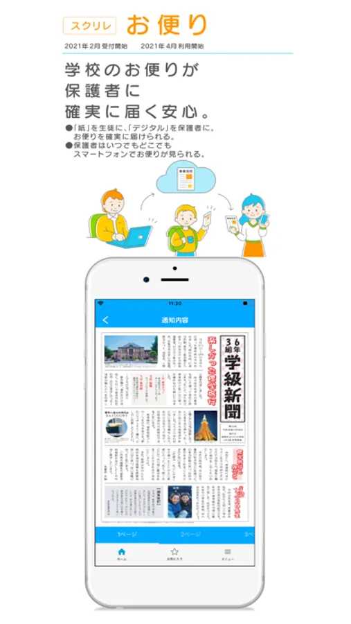 学校やPTAが配布する「お便り」を、デジタルで保護者のスマートフォンへ確実に届け、保護者はいつでもどこでも確認できます。