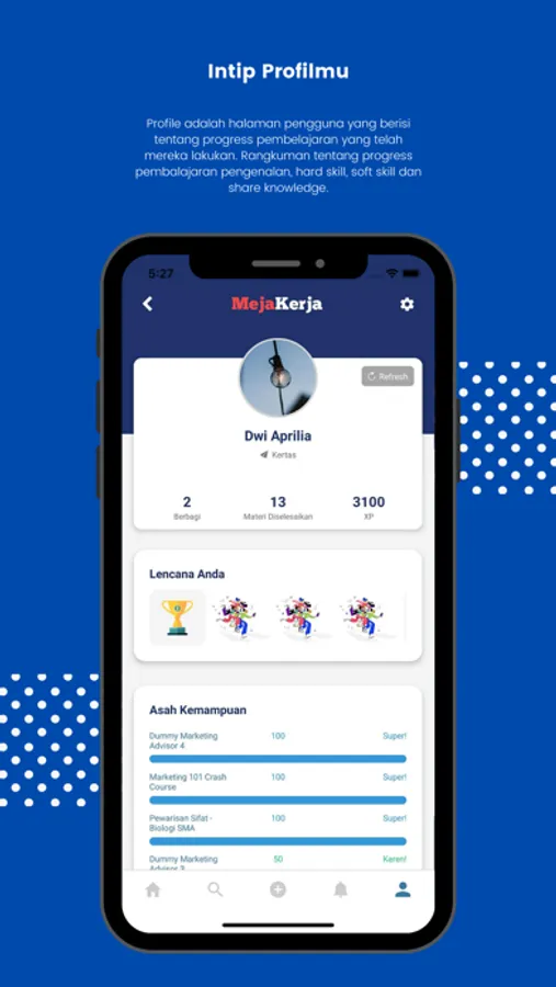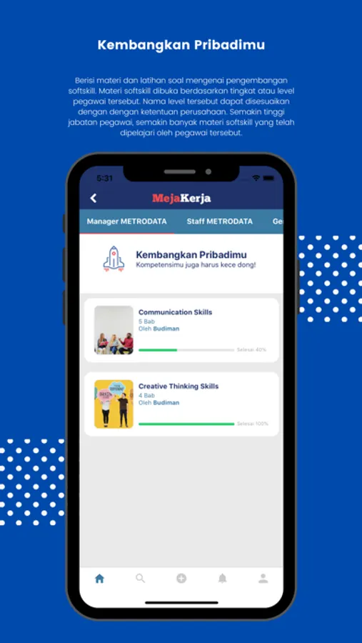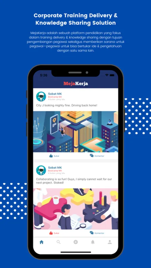 MejaKerja adalah sebuah platform pendidikan yang fokus dalam training delivery & knowledge sharing dengan tujuan pengembangan pegawai sekaligus memberikan sarana untuk pegawai - pegawai bisa bertukar ide & pengetahuan dengan satu sama lain