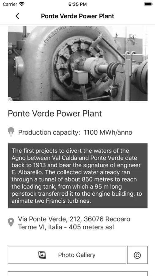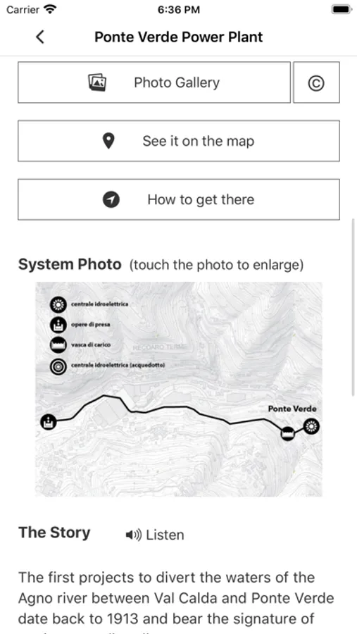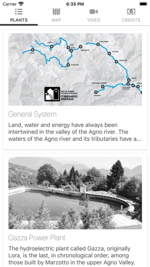 The app can be used both in consultation mode, by reading the descriptions of the main hydroelectric plants in the Valley, and as a guide to the visit, using the map and geolocation functions. Thanks to the text reading functionalities (texts by the historian Samuele Sottoriva, taken from the book "Energia dall'acqua - Le centrali idroelettriche dell'alta Valle dell'Agno", Cierre edizioni), the app can also be used as an audio guide for the itinerary.