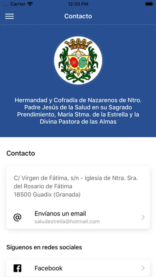 Aplicación Oficial de la Hermandad y Cofradía de Nazarenos de Ntro. Padre Jesús de la Salud en su Sagrado Prendimiento, María Stma. de la Estrella y la Divina Pastora de las Almas de Guadix, donde se puede consultar información de la Cofradía, próximas salidas y acceso identificado para los hermanos/as en el que pueden consultar/modificar sus datos personales, consultar recibos y recibir notificaciones de la Cofradía.