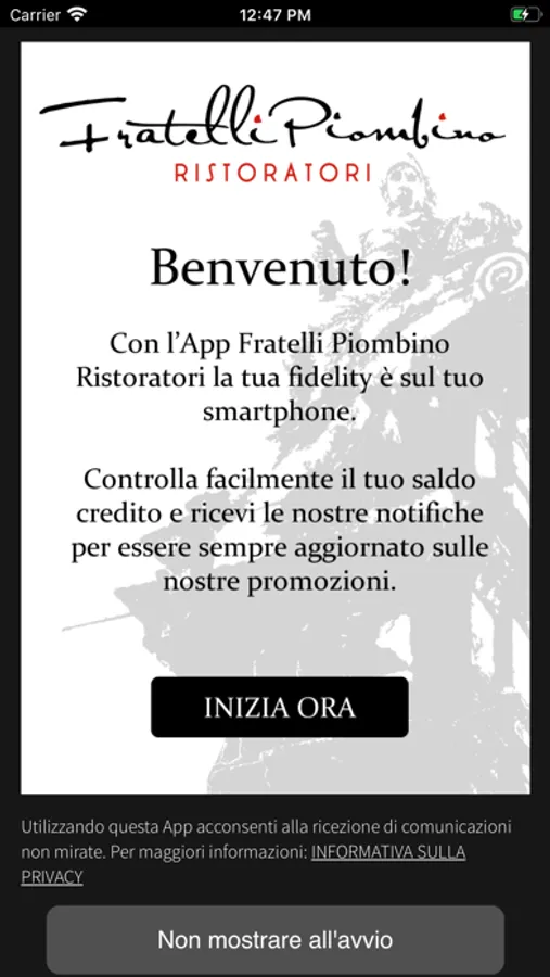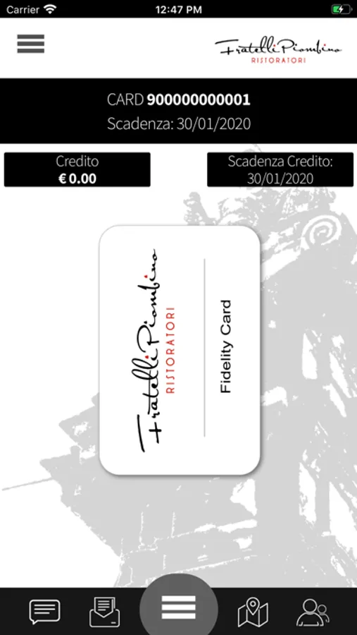 Con la Fratelli Piombino Ristoratori siamo ancora più vicini ai nostri clienti, infatti avvalendoci dell'innovazione tecnologica puntiamo a migliorare il nostro sistema di incentivazione con la Fidelity Card virtuale. I nostri clienti potranno installare la App sul proprio dispositivo mobile ed avere in questo modo tutte le informazioni sulla propria card e sui vantaggi guadagnati. La App é inoltre uno strumento di comunicazione attraverso il quale i nostri clienti saranno sempre informati sulle promozioni e le iniziative dei nostri negozi.