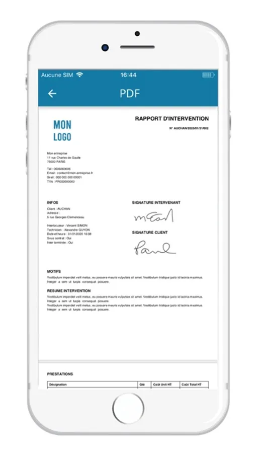 Éditez très simplement des rapports d’interventions de qualité professionnelle au format PDF pouvant intégrer des médias photos et être validé par le client grâce à la signature électronique.
