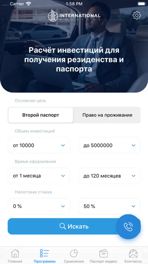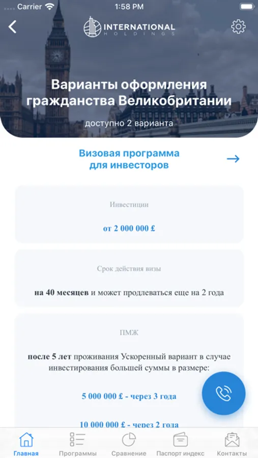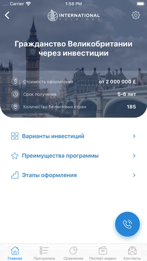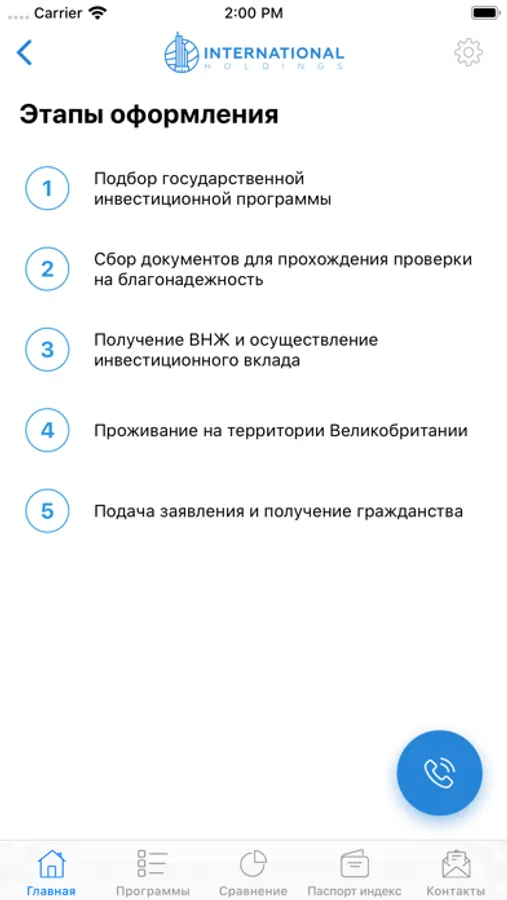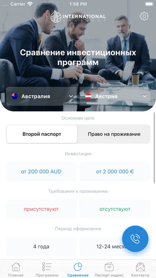 Помощь в получении гражданства и резидентства за инвестиции является основным направлением деятельности компании International Holdings. Для Вашего комфорта и оптимизации времени команда специалистов разработала приложение, в котором собрала подробную информацию о процедурах капиталовложения, особенностях и возможностях действующих инвестиционных программ.