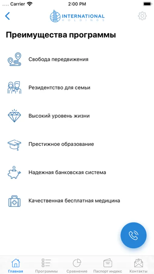 С помощью приложения возможно в любое удобное время связаться с миграционным специалистом для получения подробной консультации о действующих программах и составления персональной инвестиционной стратегии. Для быстрого поиска связи в разделе “Контакты” указаны адреса и рабочие телефоны всех представительств компании.
