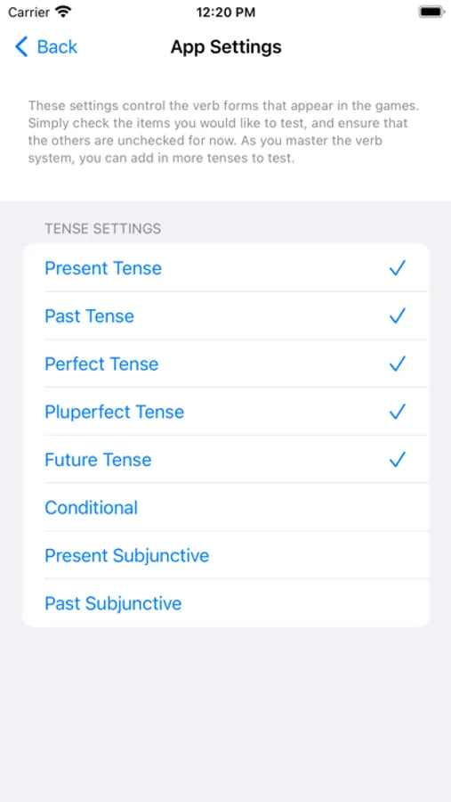 In the settings, you can select which tenses to drill in the games. So whether you're a beginner, or already on the way to mastery, there's a level for you!
