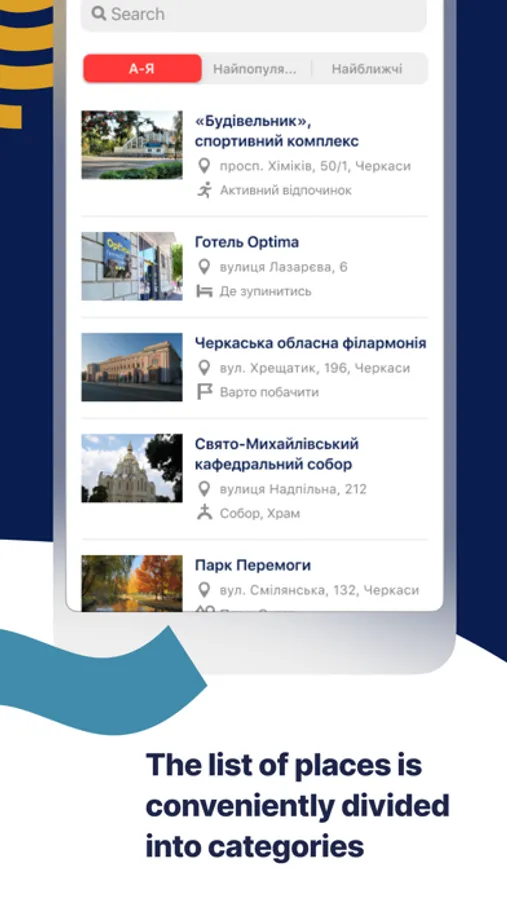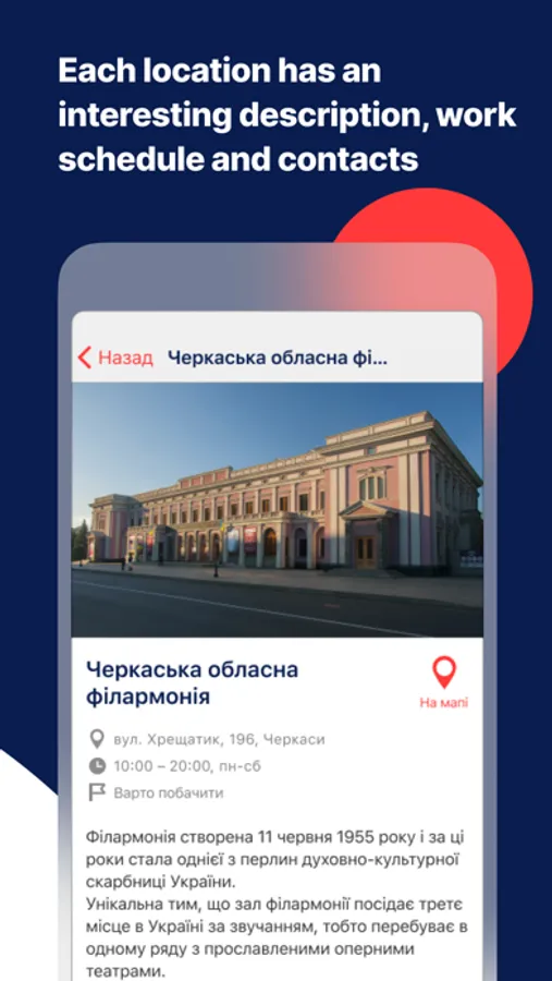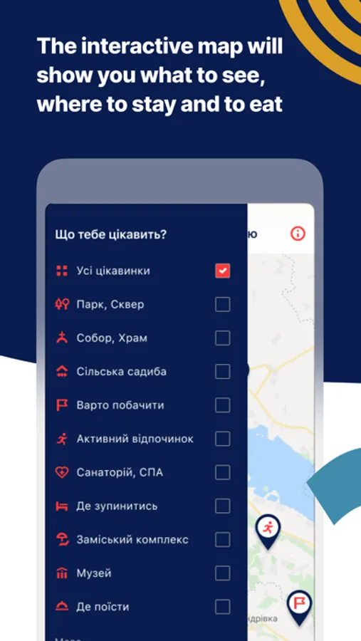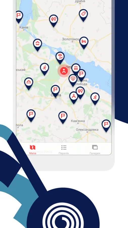The mobile application will help every tourist to discover Cherkasy region whenever he wants and whatever season of the year. The application will help you to find a tourist location and tourist landmark, to find places where to eat, where to stay, to have rest, to go shopping and where ,,to recharge your batteries” with power.