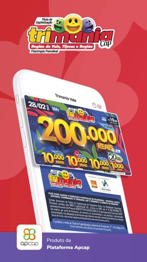 O TRIMANIA CAP é um Título de Capitalização de Pagamento Único, da Modalidade Filantropia Premiável, com atuação na Região do Vale, Tijucas e Região , aprovados pela SUSEP e emitidos pela Kovr Capitalização (CNPJ nº 93.202.448/0001-79). Além de proporcionar o direito de participação em sorteios ao subscritor, com o TRIMANIA CAP você pode contribuir para o desenvolvimento e custeio da FUNDAÇÃO HOSPITALAR DE BLUMENAU - SANTO ANTÔNIO inscrita sob CNPJ nº 82.654.088/0001-20 , através da cessão do direito de resgate do seu Título, gerando recursos que serão investidos na construção de novas alas, assim como nas reformas estruturais e aquisição de novos equipamentos hospitalares Conheça mais sobre o trabalho e os projetos Da FUNDAÇÃO HOSPITALAR DE BLUMENAU - SANTO ANTÔNIO no site: www.hsan.com.br