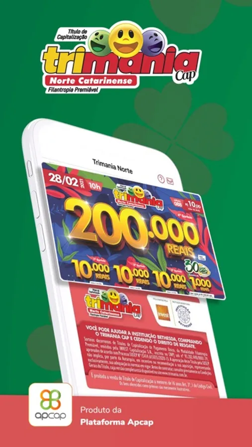 O TRIMANIA CAP é um Título de Capitalização de Pagamento Único, da Modalidade Filantropia Premiável, com atuação na Região Norte Catarinense, aprovados pela SUSEP e emitidos pela Kovr Capitalização CNPJ nº 93.202.448/0001-79). Além de proporcionar o direito de participação em sorteios ao subscritor, com o TRIMANIA CAP você pode contribuir para o desenvolvimento e custeio da INSTITUIÇÃO BETHESDA inscrita sob CNPJ nº 84.712.983/0001-89, através da cessão do direito de resgate do seu Título, gerando recursos que serão investidos na prestação de serviços de assistência à saúde com a finalidade de prestar assistência médica e hospitalar nas diversas atividades da instituição Conheça mais sobre o trabalho e os projetos Da INSTITUIÇÃO BETHESDA no site: www.portalbethesda.org.br .