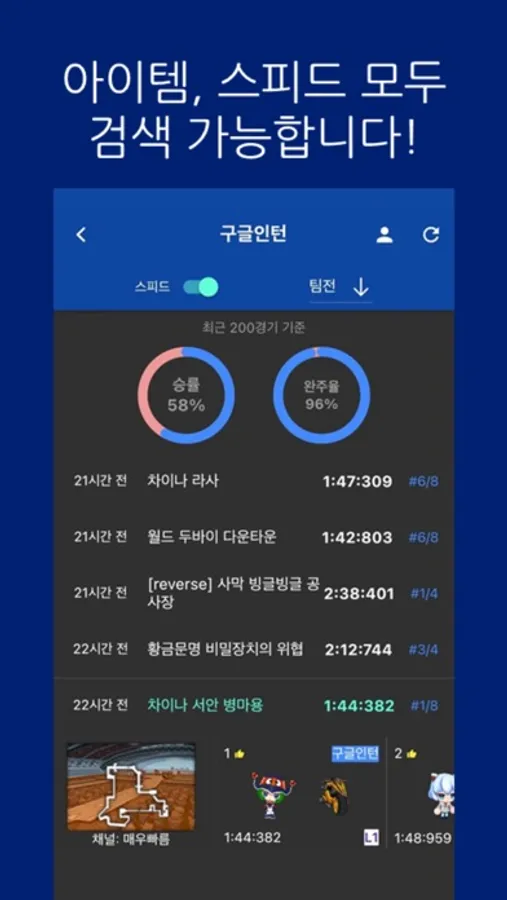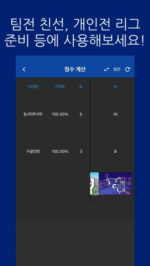 카트라이더 게임에서 원하는 유저의 아이템 개인전/팀전, 스피드 개인전/팀전, 클럽 아이템전/스피드전 전적을 볼 수 있습니다. 또한 개인전/팀전 점수 계산도 가능합니다.