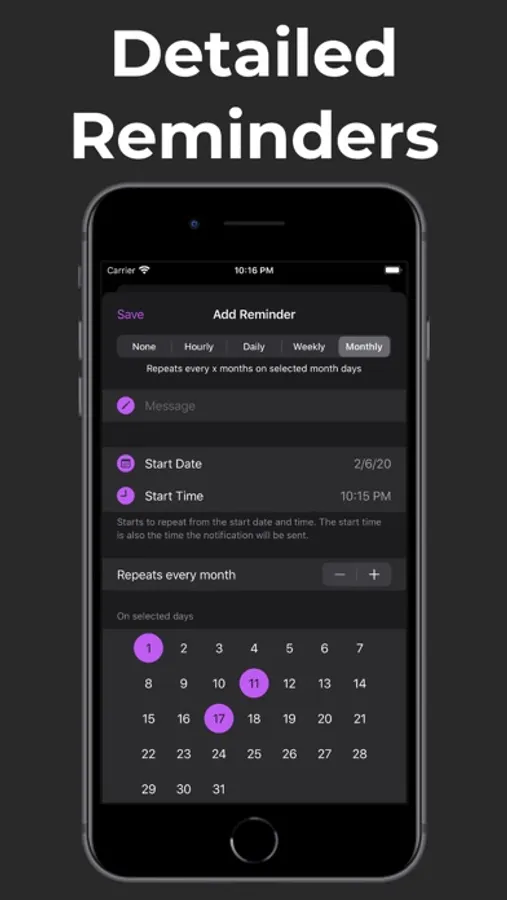 Tasks and reminders can repeat hourly, daily, weekly or monthly.