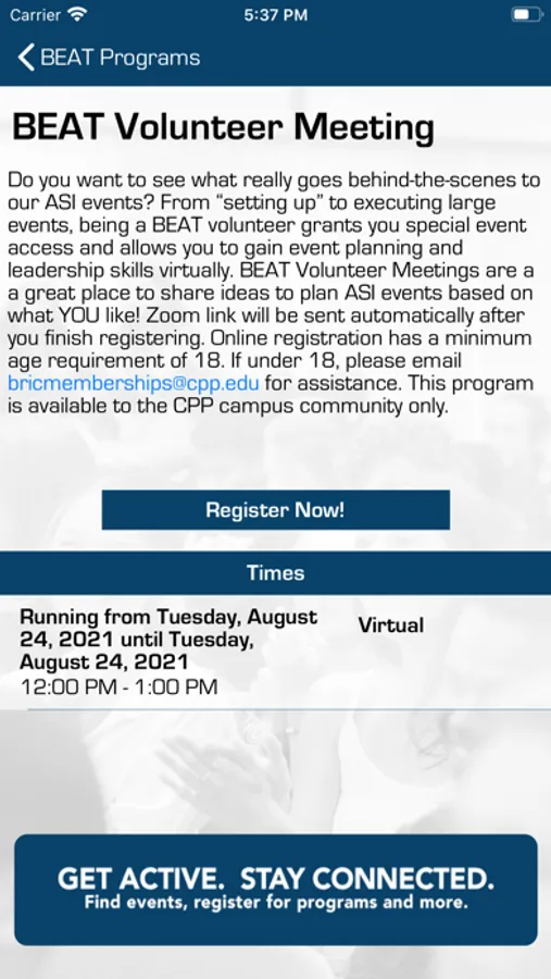The official app for Associated Students, Inc., Cal Poly Pomona to stay updated on all programs, events, and services right at your fingertips! Conveniently register for a variety of ASI’s offerings (both in-person and virtually), including group fitness classes, free groceries through Poly Pantry 2 Go, outdoor trips, intramural sports, SCUBA certifications, rock climbing workshops, cooking classes, celebrity meet and greets, concerts, aquatic workouts, and more!