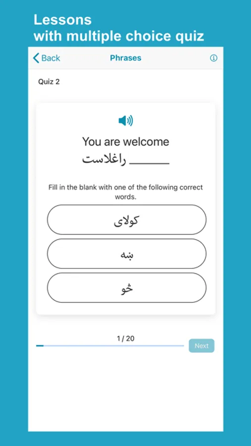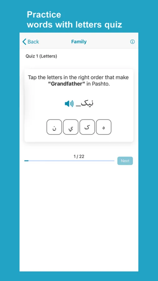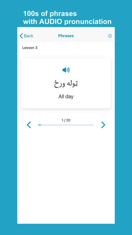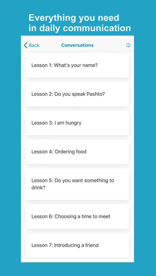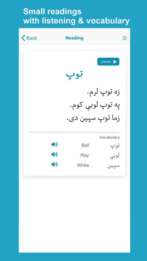 Learn Pashto application helps non-Pashto and Pashto speakers learn and improve Pashto language skills. The app has complete materials to help you learn fast and accurately. The app divides lessons into words, phrases, conversations, alphabet, numbers, reading, grammar, and quizzes with Pashto audio pronunciation and images for each word.