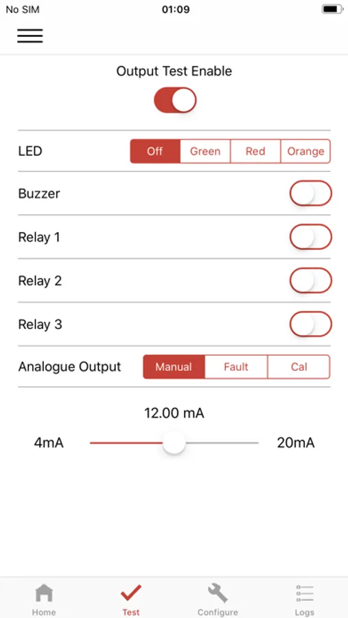• Maintenance (test LED/buzzer operation, relays and analogue output level.)