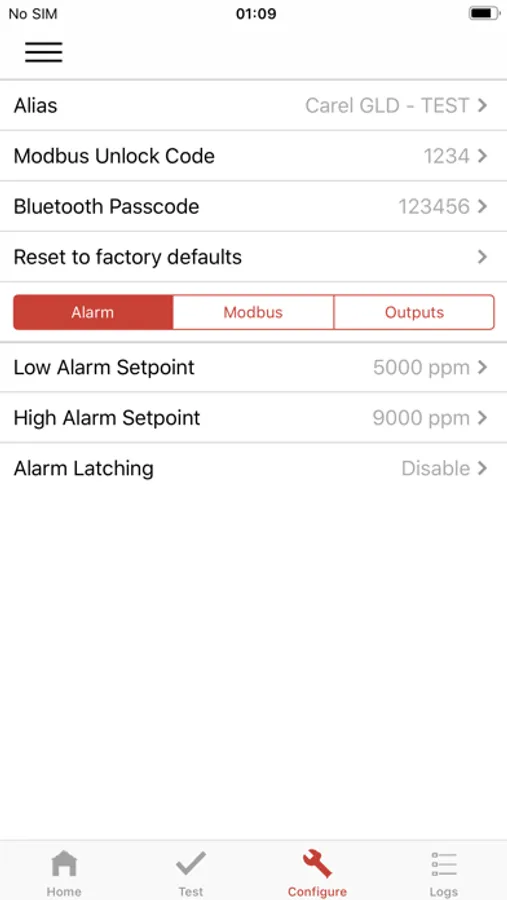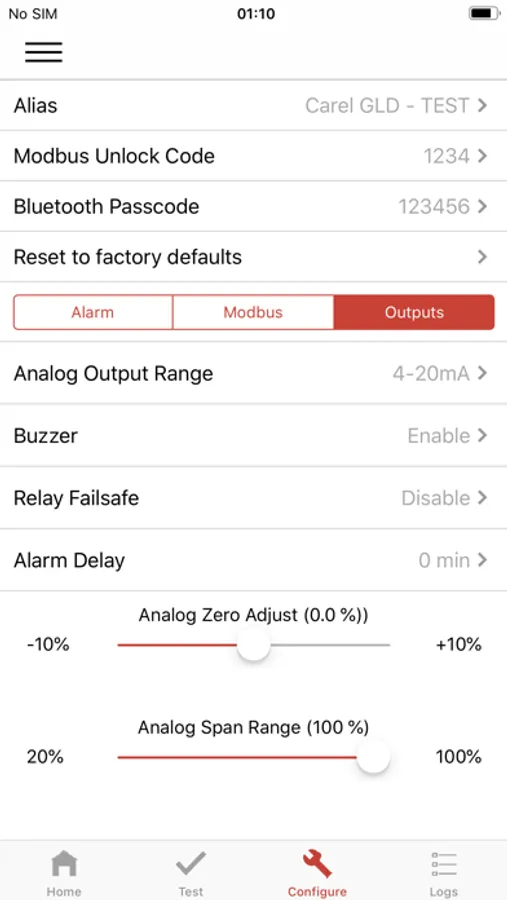 • Configuration (rename device, define alarm thresholds, change Modbus settings, configure relay behaviour and manage analogue output settings.)