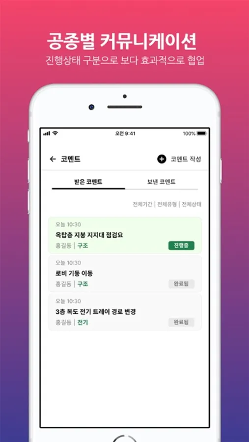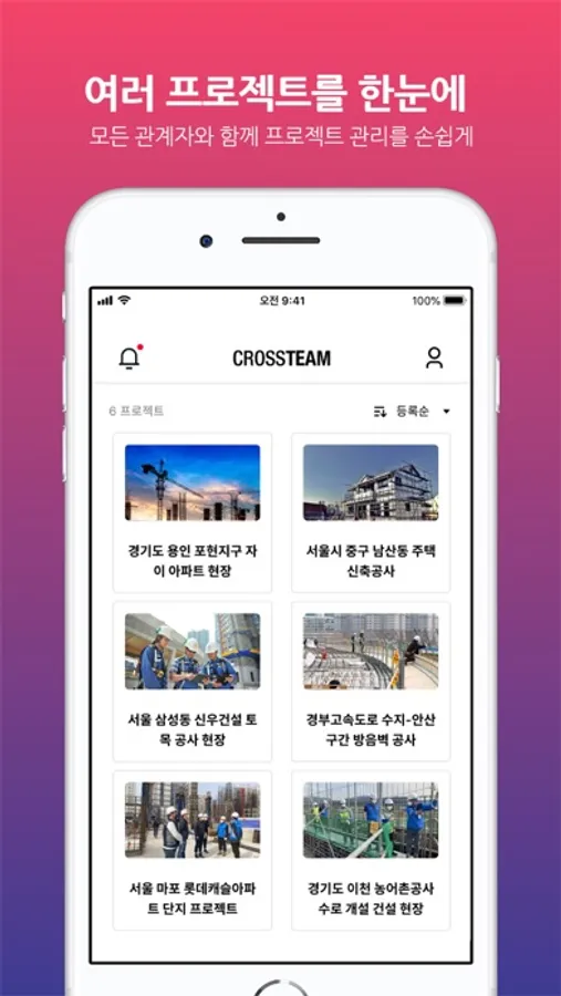 크로스팀은 시공 작업시 초대받은 관계자들이 크로스팀 애플리케이션을 통해 정보를 확인하고 어디서든 커뮤니케이션 및 문서를 작성할 수 있습니다.