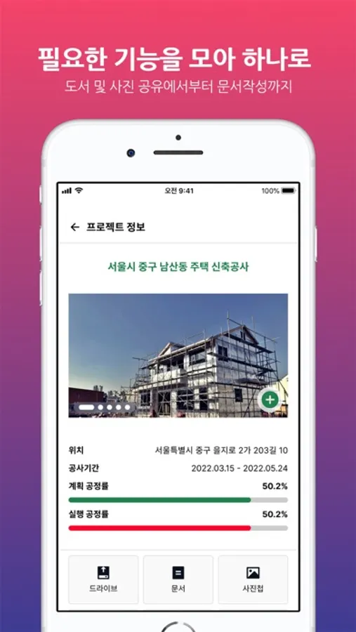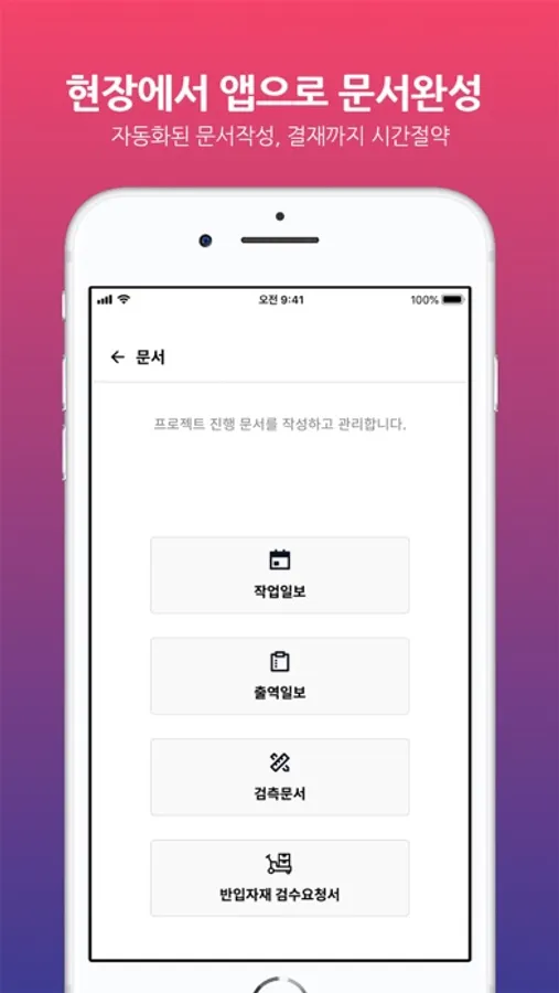 외부 작업이 많은 관계자들을 위해 모바일 서비스를 중심으로 개발하였으며, 업무를 효율적으로 진행하도록 도와주는 시공에 최적화된 협업툴입니다.