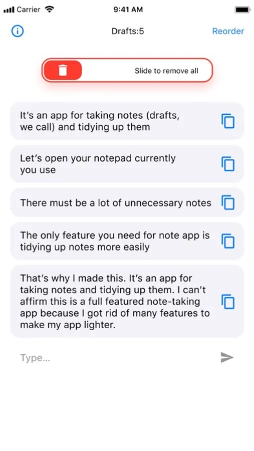 That's why I made this. It's an app for taking notes and tidying up them. I can't affirm this is a full featured note-taking app because I got rid of many features to make my app lighter. It's more like draft than note what you can take with this app is. So, I named this "DraftDog". Why "Dog"? Because doggies are cute.