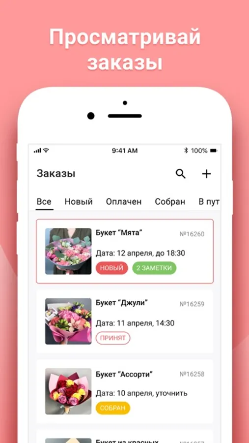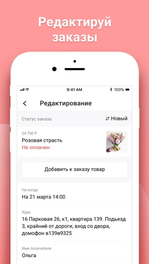 Приложение помогает отслеживать количество заказанных букетов, дату и время их доставки, местоположение, адрес, имя и телефон покупателя, остаток цветов в магазине.