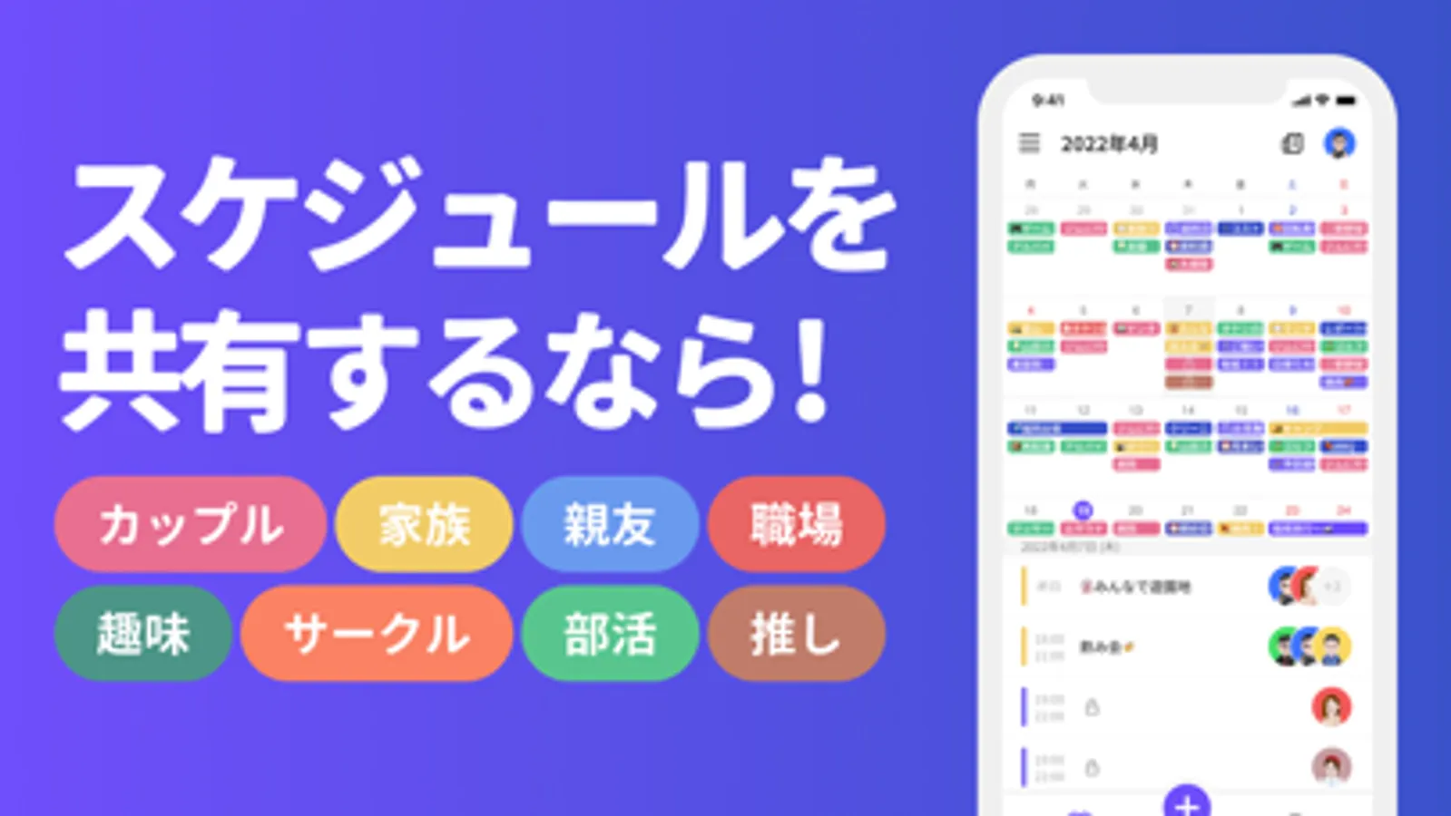 一緒に過ごすことの多い、仲の良い友達や家族、カップルでのスケジュール共有や、部活やサークル、職場、趣味のコミュニティといったグループの予定表の配信に最適です!