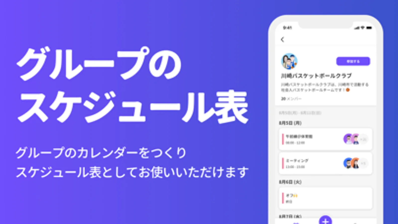 部活動やサークル、職場、趣味のコミュニティなどのグループカレンダーをつくれるから、予定表としても大活躍!メンバーは自分の予定と重ねて確認できるから、毎回 LINE などのメッセージで知らせる必要はありません。