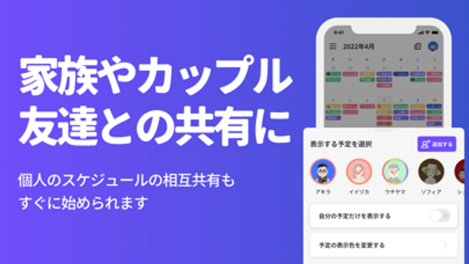 共有相手やグループのスケジュールが見れるカレンダー。誰の予定を表示するかの選択や、表示する予定の色の設定、自分の予定だけの表示もできます!