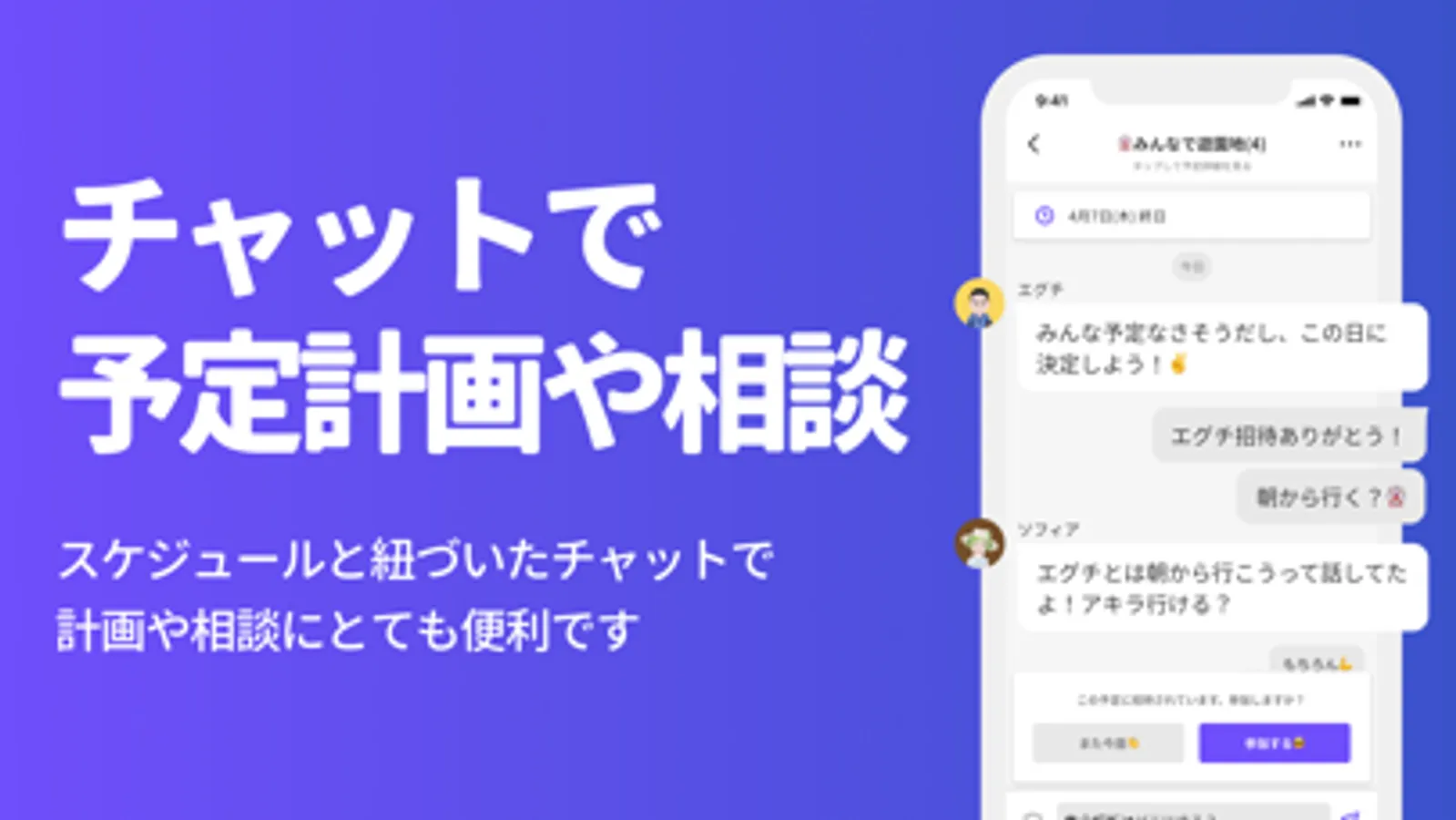 チャット機能で予定についてのやりとりを行いましょう。チャットは予定ごとに紐づいているから、後から簡単に振り返れます。
