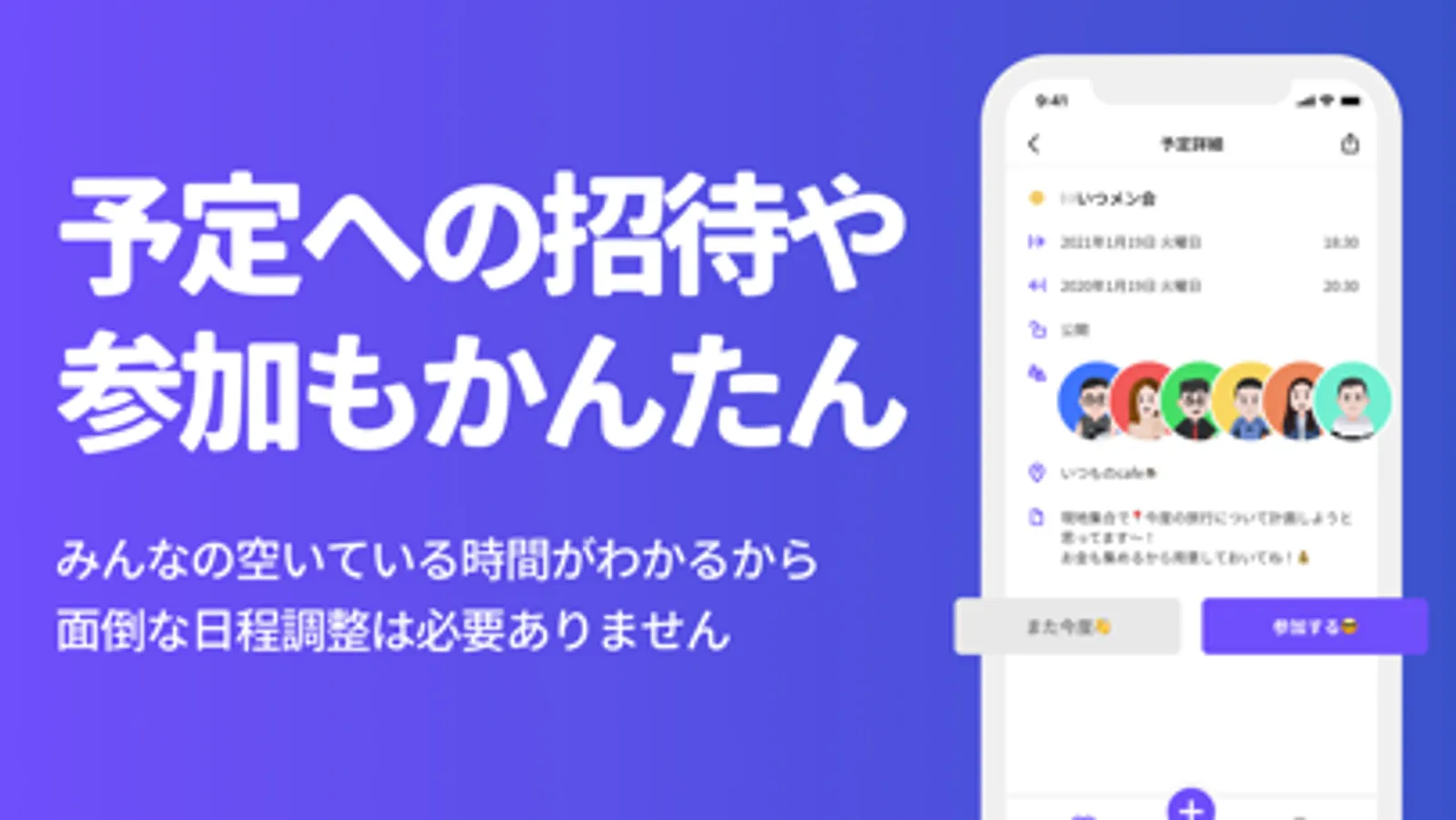 スケジュールを共有することで相手の予定がわかるから、日程調整がすぐに終わります。共有相手を招待した予定も作成できるので、みんなで効率的に予定を管理可能です!