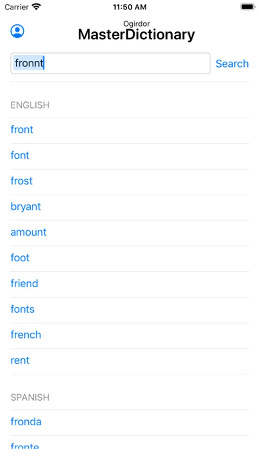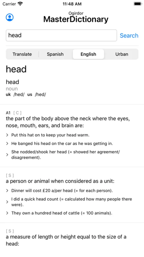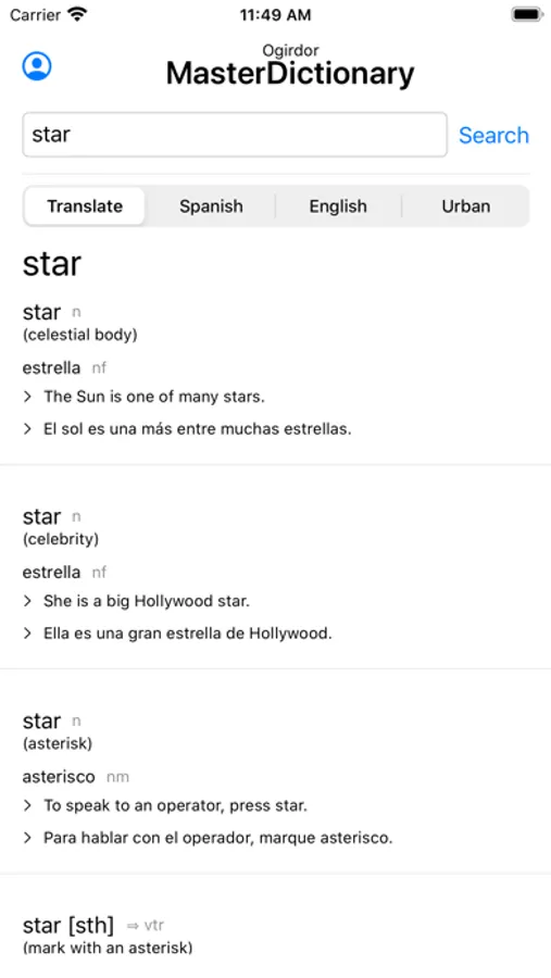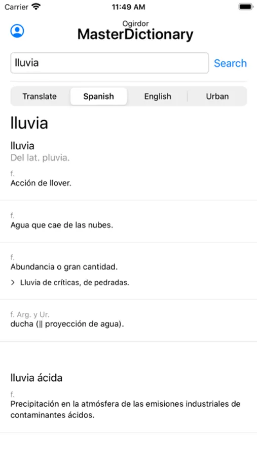 Ogirdor MasterDictionary is very simple to use. Just search for a word in Spanish or English and you will be shown between 1 and 4 pages of results. The first, with the corresponding translations. The second, with all the academic definitions for that word in Spanish. The third, with all the academic definitions for that word in English. And the fourth, with some alternative definitions from English urban language.