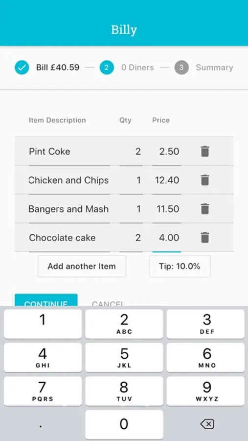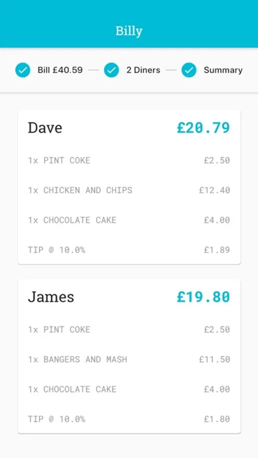 Just take a picture of your bill in a restaurant or bar, Billy will automatically scan the bill and pull out each of the items. Then each person says what they are paying for. You can add a tip, and then see how much everyone needs to pay.