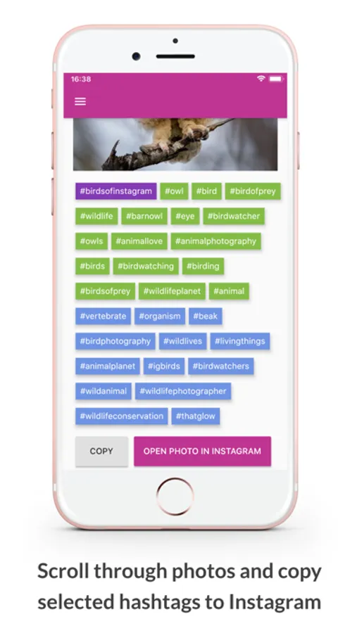 2. Tap to deselect any hashtags you don't want, tap Copy and then tap Open photo in Instagram.