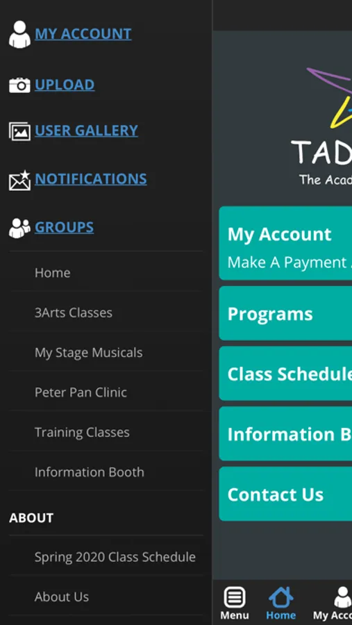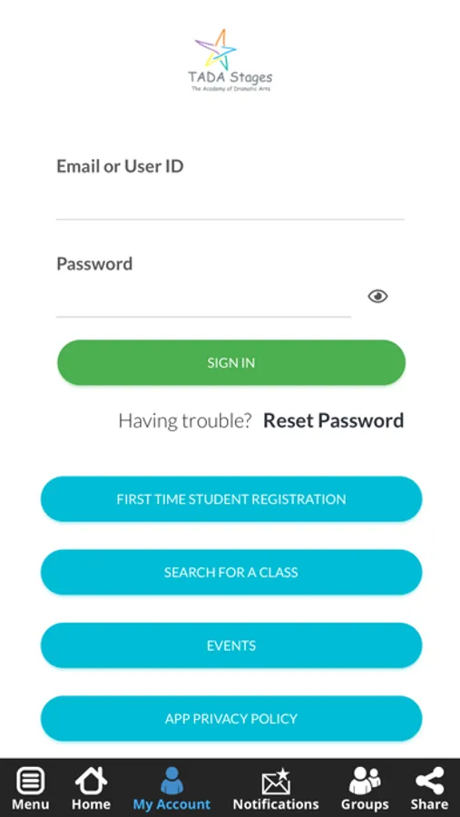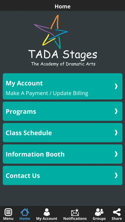 The TADA Stages app allows you to register for classes and summer camps, access our calendar, receive notifications, access social media links, and review important account information.