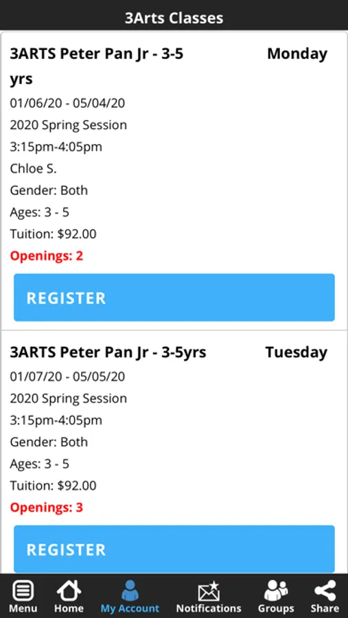 - Have a class in mind? Search by program, age, day, and time. You can register or even put yourself on a wait list.