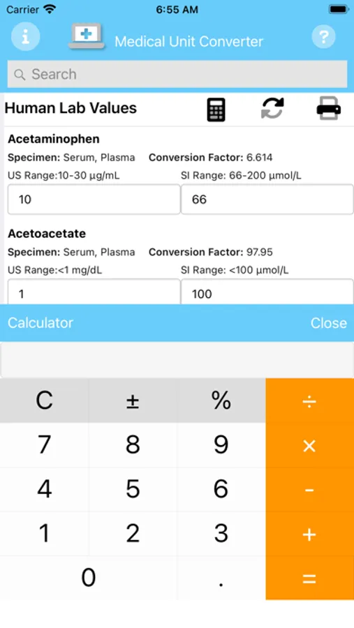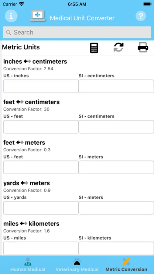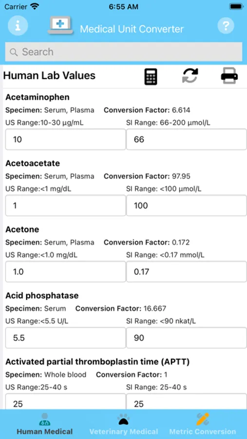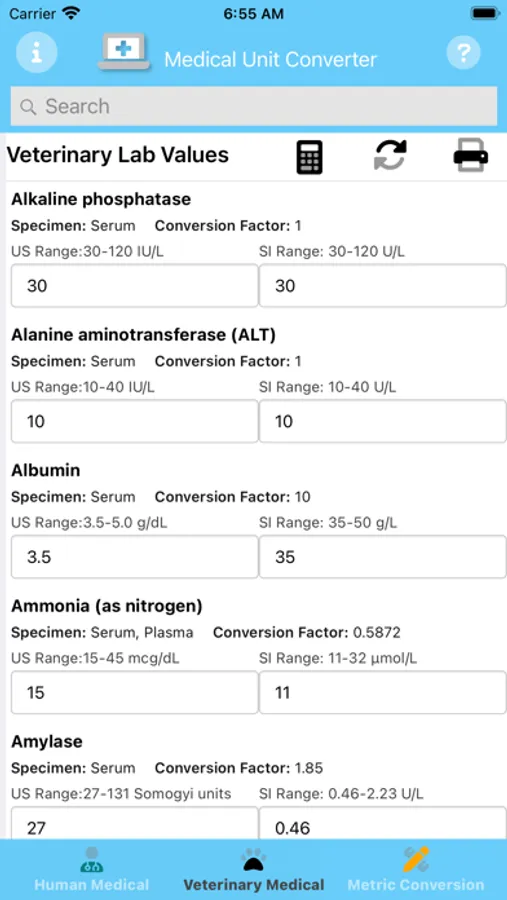 Medical Unit Converter easily converts between US and International Human and Veterinary Medical units and Metric values. Enter a value in either the US or International input area and it will immediately be converted. Search for individual Units by typing in the name of the test.