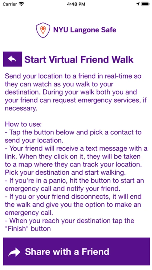 - Virtual Friend Walk: Send your location to a friend through email or SMS on your device. Once the friend accepts the Friend Walk request, the user picks their destination and their friend tracks their location in real time; they can keep an eye on them to make sure they make it safely to their destination.