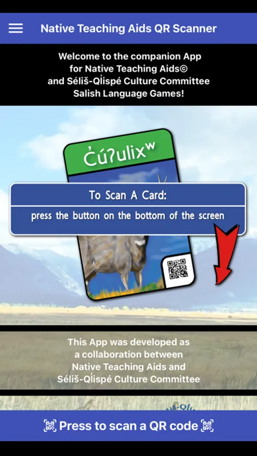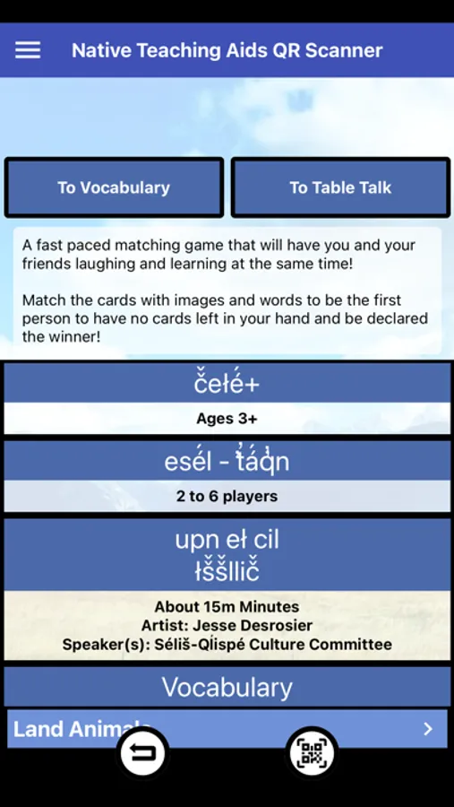 QR Reader companion app for physical Salish Qlispe Games. For full listing of our Salish Qlispe games go to our store https://www.nativeteachingaids.com/shop?category=Bitterroot+Salish+Language+Games