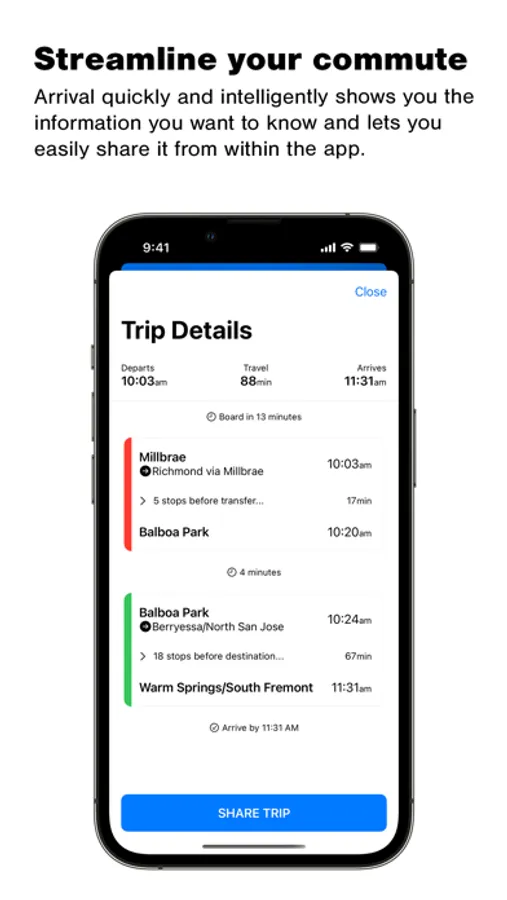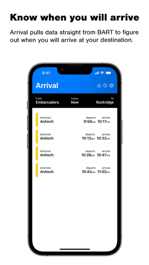 One of Arrival's best features is that it is fast. Really fast. It loads the information you need quickly and without any extra steps. This allows you to take BART throughout the San Francisco Bay Area with ease.