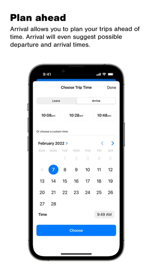 In Arrival v2 you can schedule trips by when you would like to depart or arrive. To do this set a destination station, then, tap the leave now button.