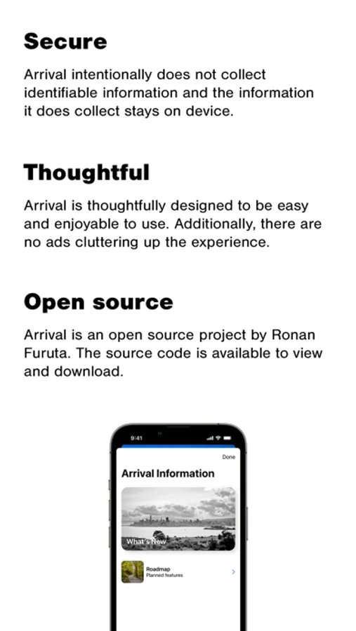Arrival intentionally does not collect identifiable information. It processes as much data as it can on device. Additionally, it does not sell or share information with 3rd party advertisers.